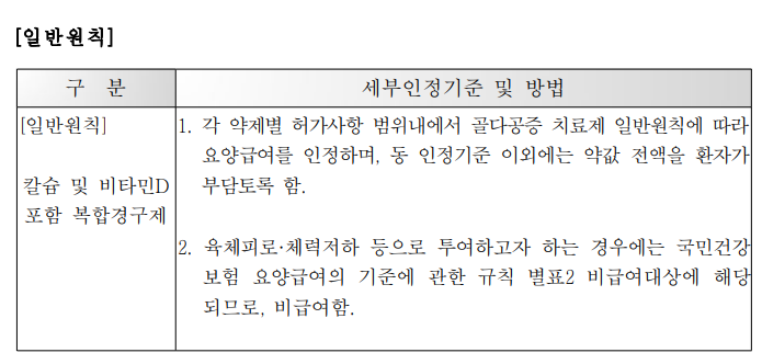 - 각 약제별 허가사항 범위내에서 골다공증 치료제 일반원칙에 따라 요양급여를 인정하며, 동 인정기준 이외에는 약값 전액을 환자가 부담토록 함.