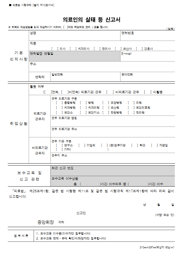 + 의료인의 실태 등 신고서 파일 작성 (아래 파일 참조) 및 출력